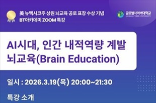 글로벌사이버대학교(총장 공병영) 뇌교육대학과 평생교육원이 공동 운영하는 대중 릴레이 특강 ‘BT아카데미’가 오는 3월 19일(목) 저녁 8시 대중강연을 개최한다.이번 강연은 특히 최근 미국 뉴멕시코주 상원(New ...